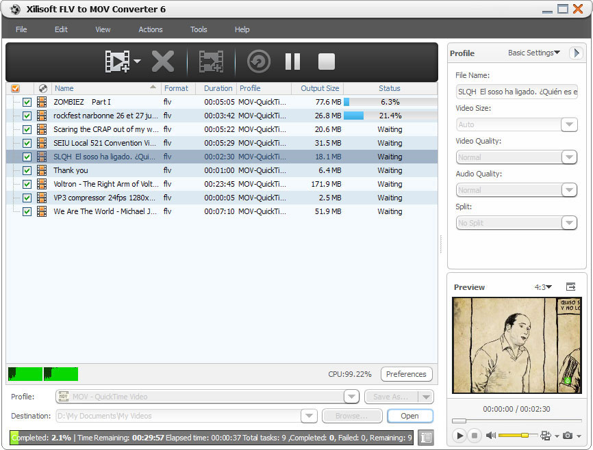 Convert FLV video files to MOV in batches for playback on QuickTime player.
